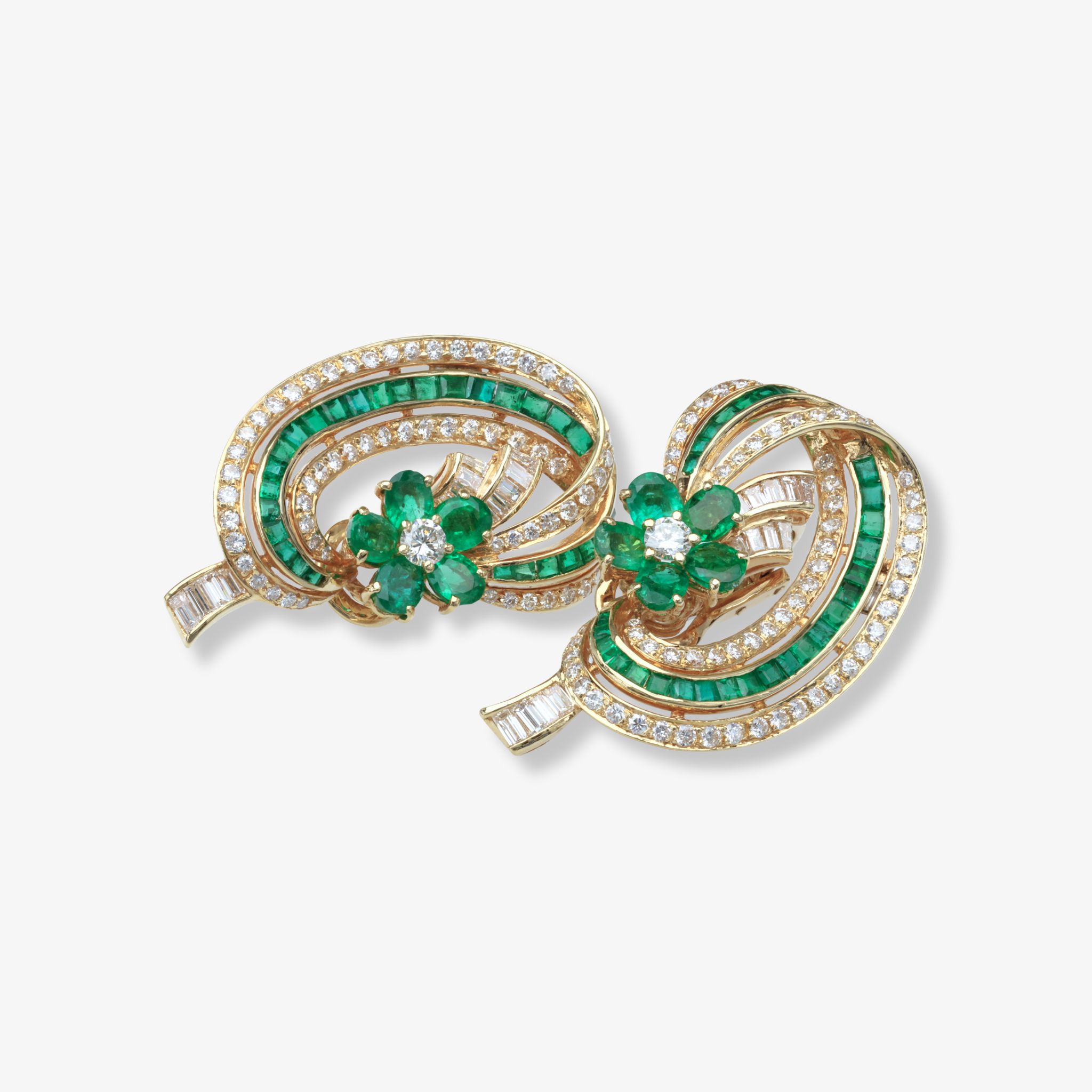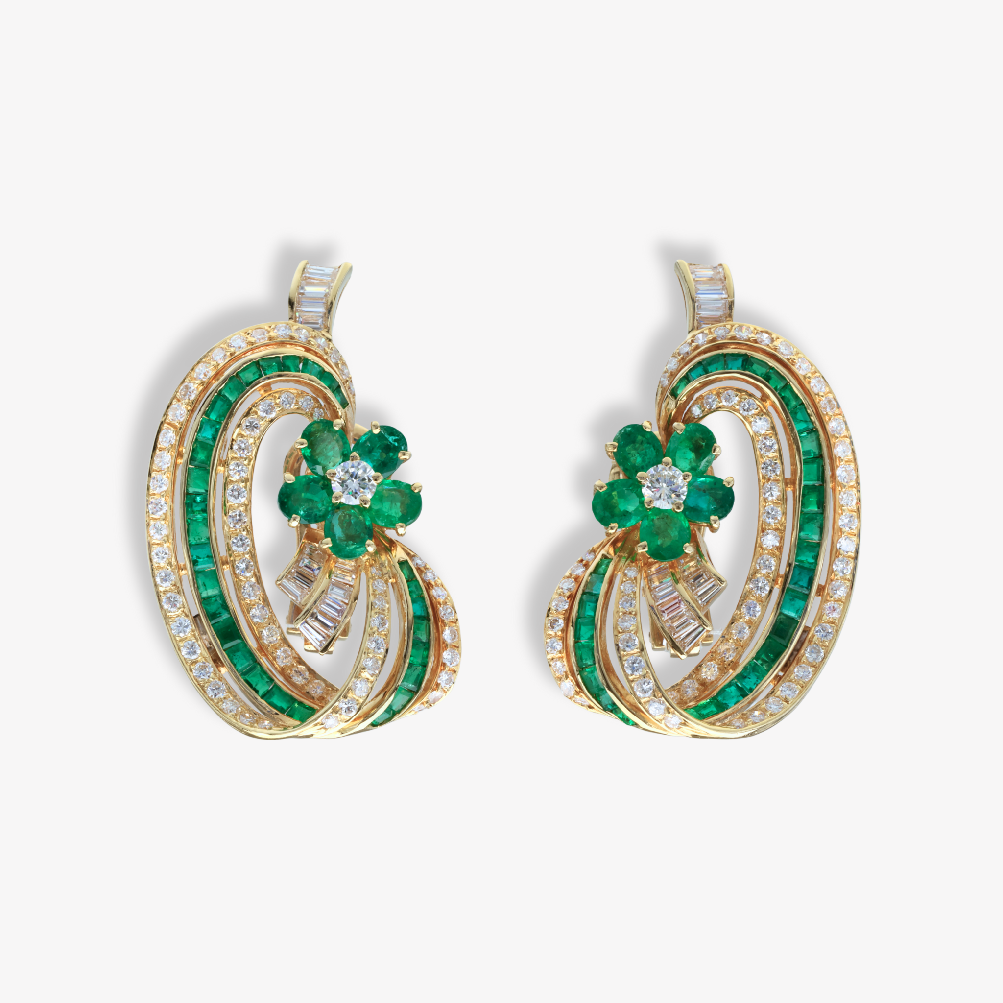 Designed and hand crafted by Sabbadini, these emerald and diamond earrings exemplify the Milanese house’s signature blend of modernity and craftsmanship. Each earring centers on a floral cluster of oval cut fine green emeralds with a round brilliant cut diamond at its center, surrounded by an intricate composition of channel-set carre cut emeralds, as well as round and baguette diamonds.